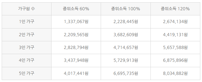 - 소득 기준 : 가구 월 소득이 중위소득 100% 이하