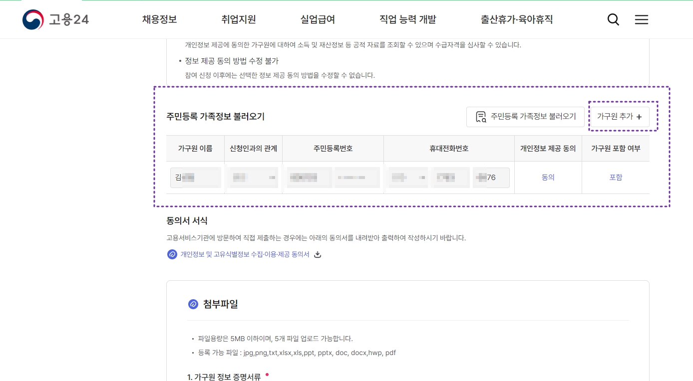 가구원 자동으로 나옵니다 (가구원 추가 하실 거면 추가버튼 눌러주세요)