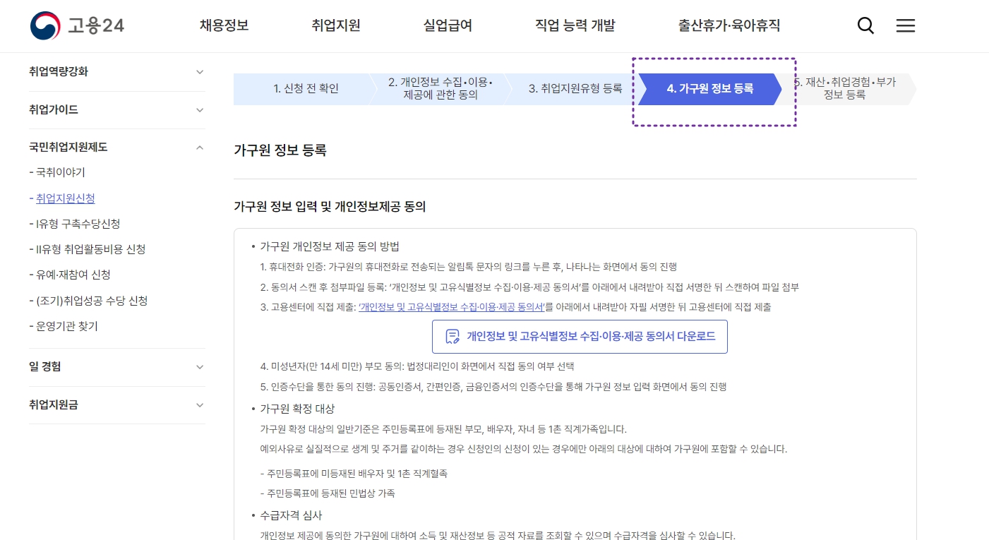 - 서류 제출 : 취업지원 신청서, 개인정보 동의서, 행정정보 공동이용 동의서,