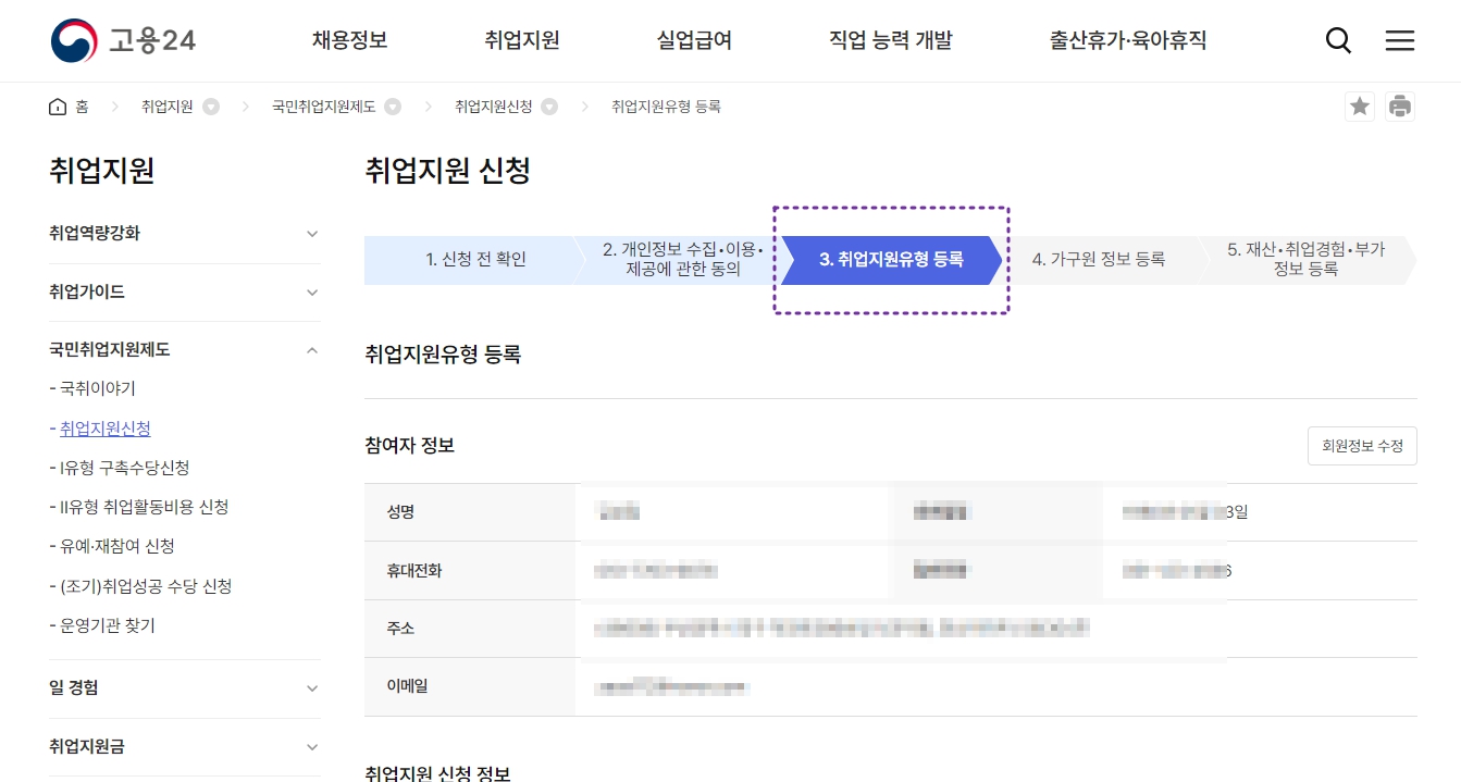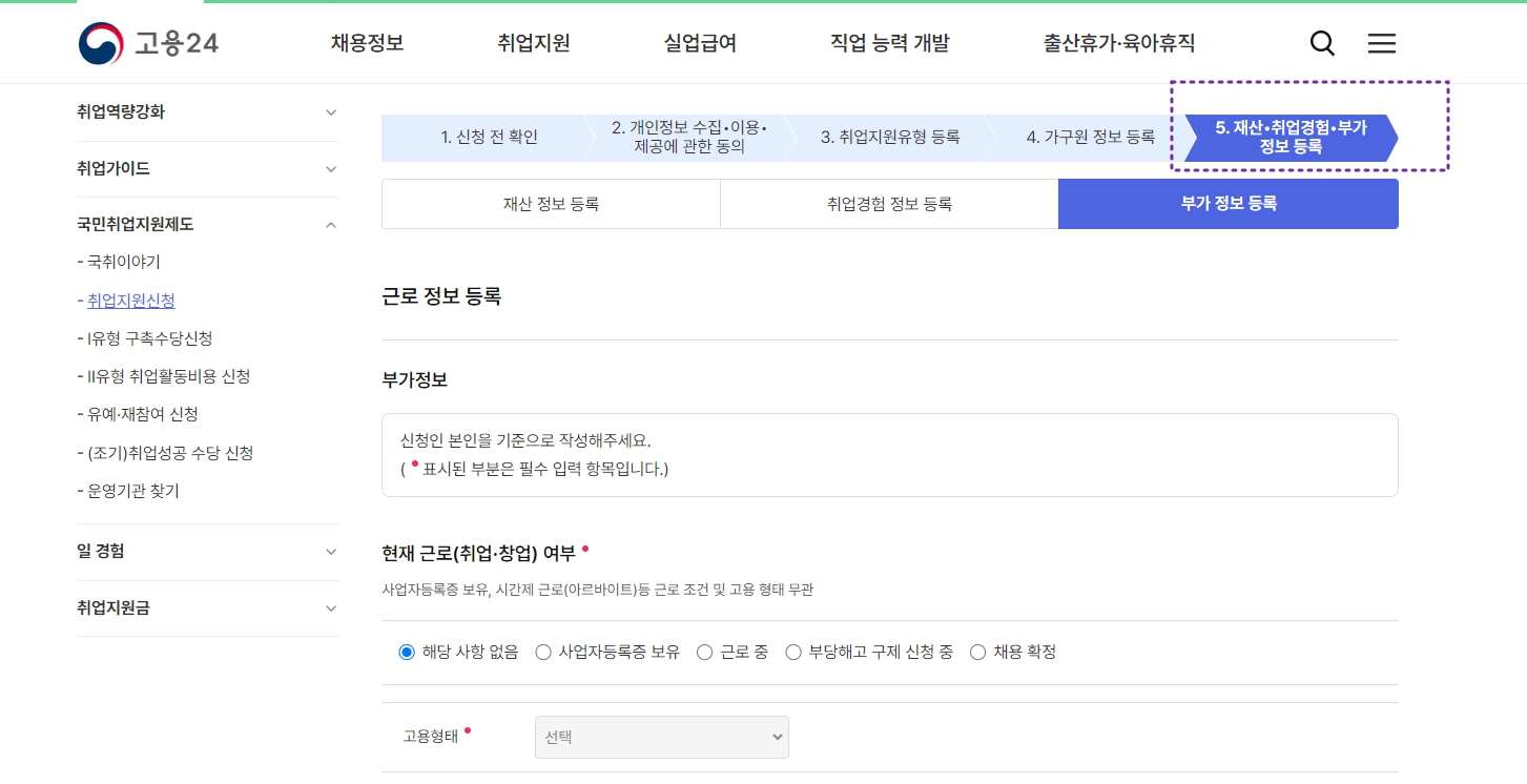 3. 신청서 작성 : '국민취업지원제도' 메뉴에 들어가 신청서를 작성합니다.