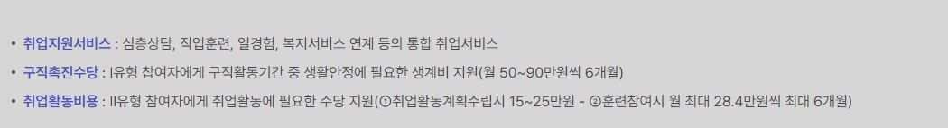 - 구직촉진수당 : 월 최대 50만원의 생계지원금 제공 (최대 6개월)