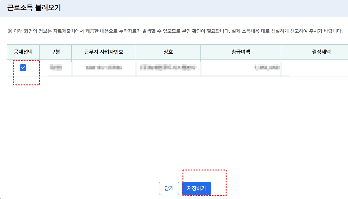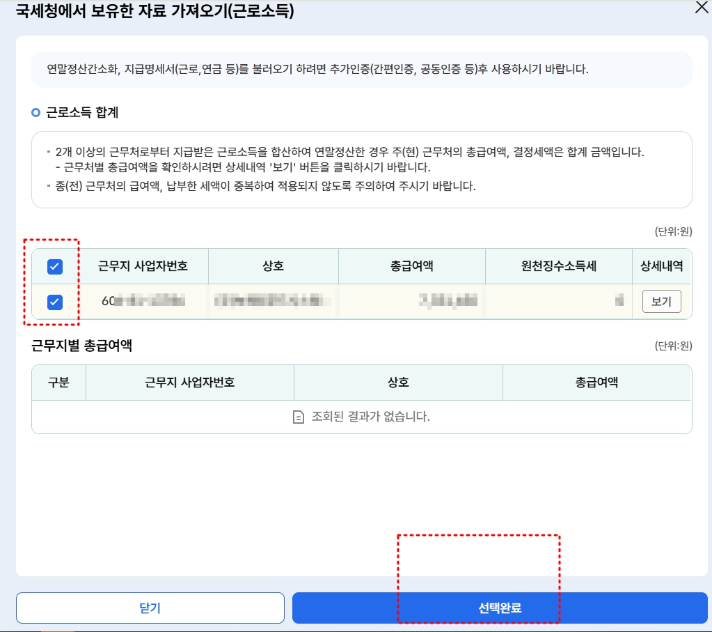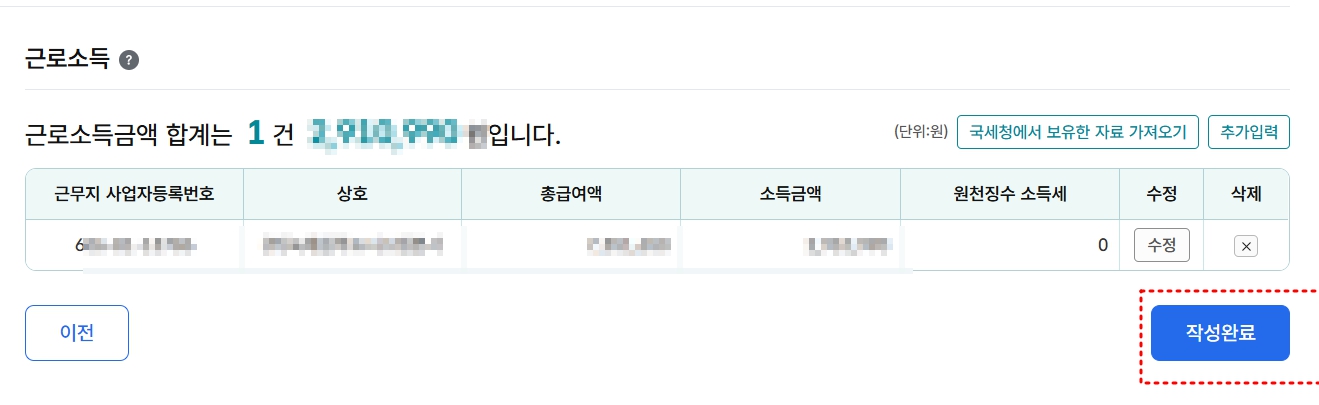 근로소득 선택하기 클릭하면 국세청에서 자료를 가지고 옵니다