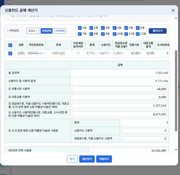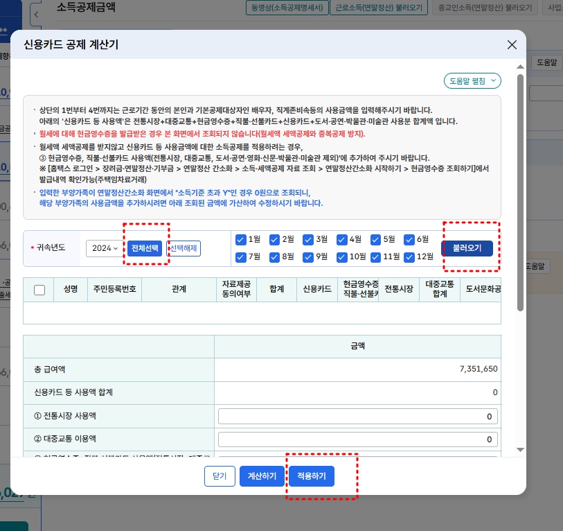 소득공제금액->근로소득 불러오기->신용카드 불러오기->적용