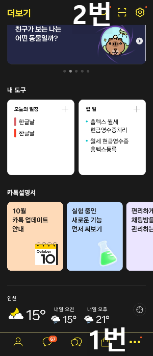 스마트폰 카카오톡 들어가기->오른쪽 하단 ... 점3개 터치->상단 (톱니바퀴 옆에 있는) 아이콘 터치