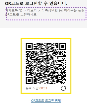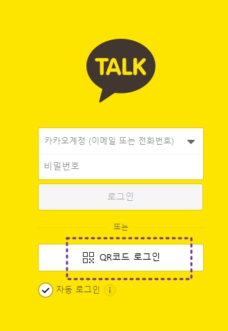 설치가 완료되면 로그인 화면이 나타납니다. 스마트폰에서 카카오톡을 사용 중이라면, QR 코드를 이용해 빠르게 로그인할 수 있습니다. QR코드 로그인 더블클릭 하세요